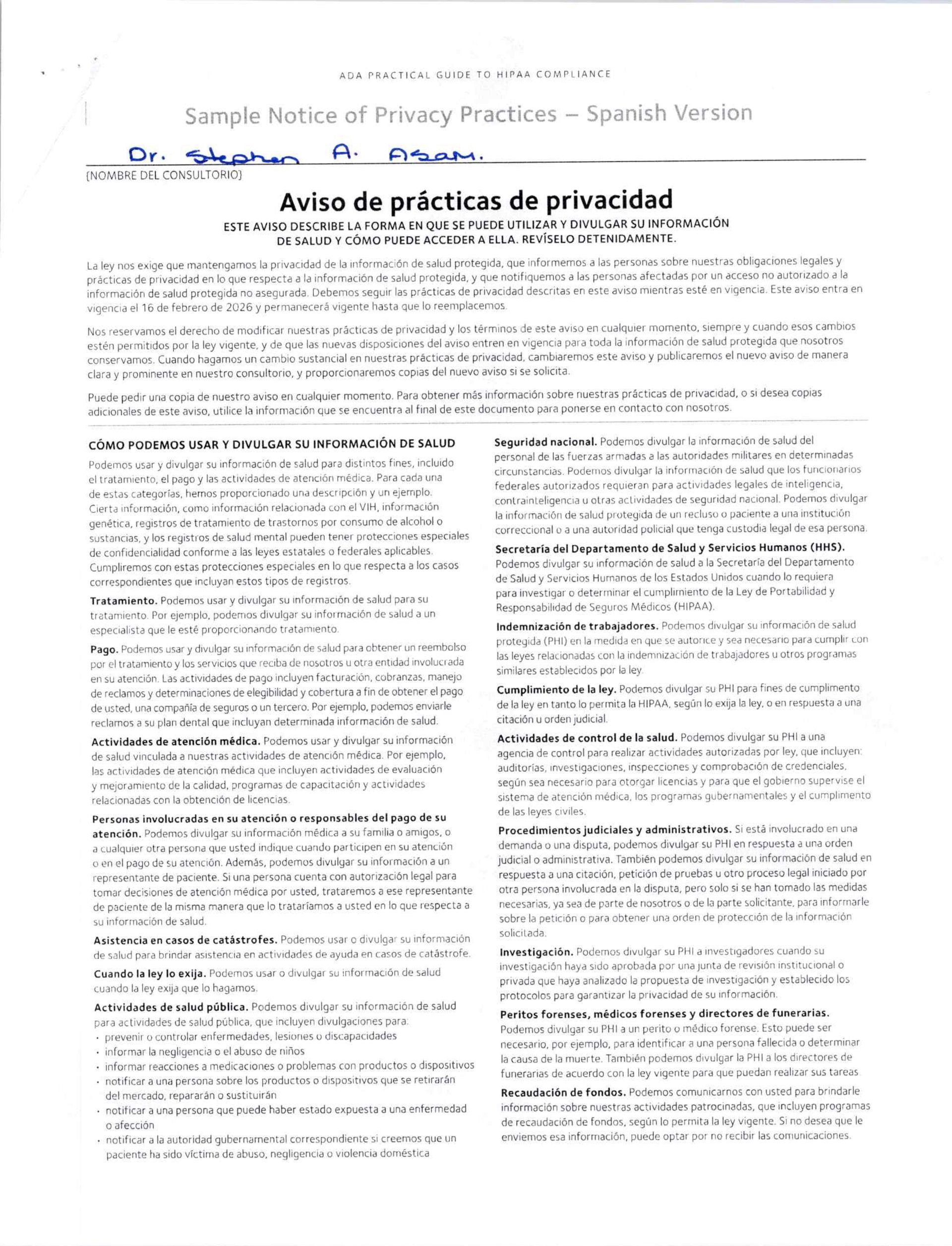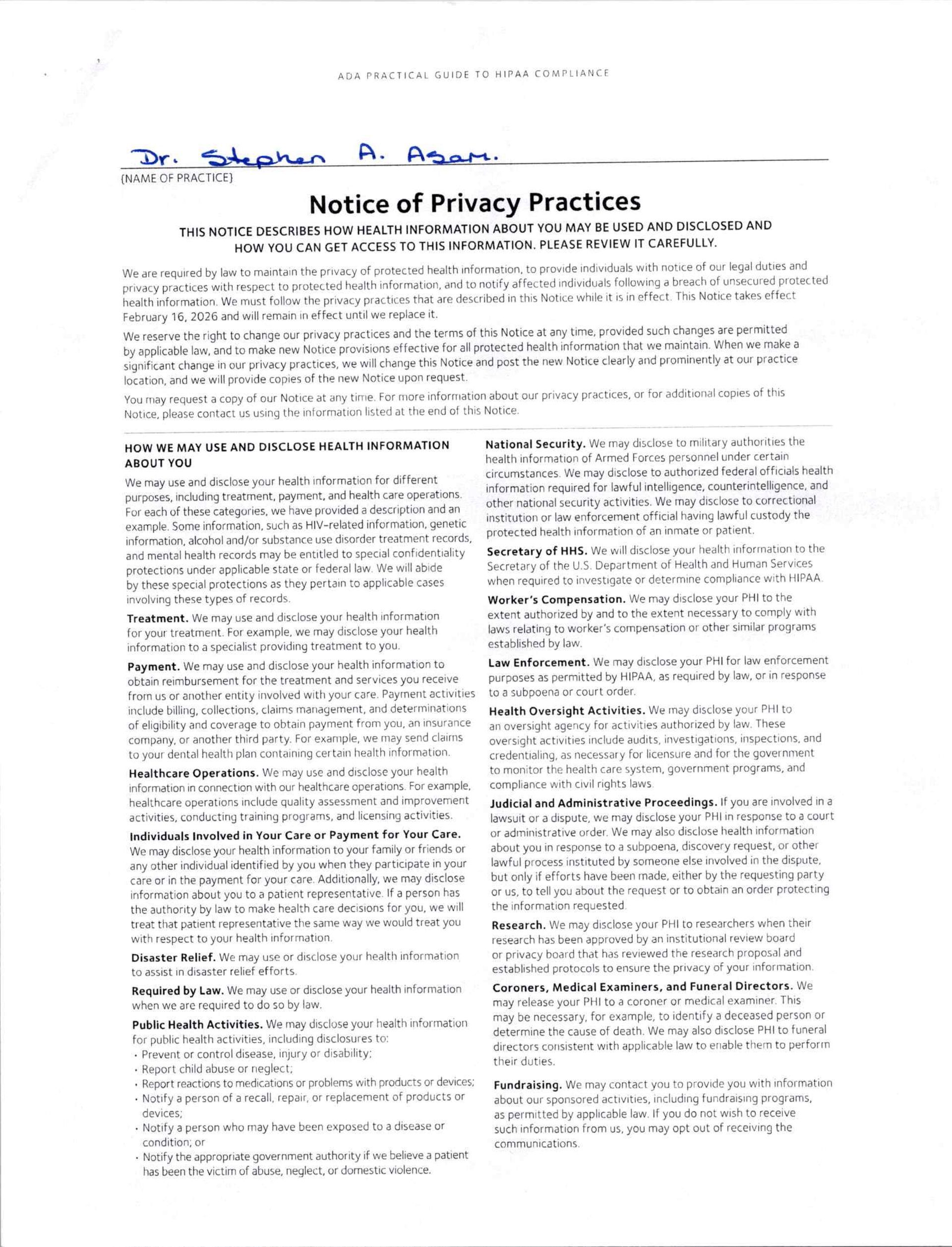 To exercise your rights described in this Notice, send your request, in writing, to our Privacy Officer at the address listed at the beginning of this Notice. We may ask you to fill out a form that we will supply. To exercise your right to inspect and copy your Protected Health Information, you may also contact your physician directly. To get a paper copy of this Notice, contact our Privacy Officer by phone or mail.