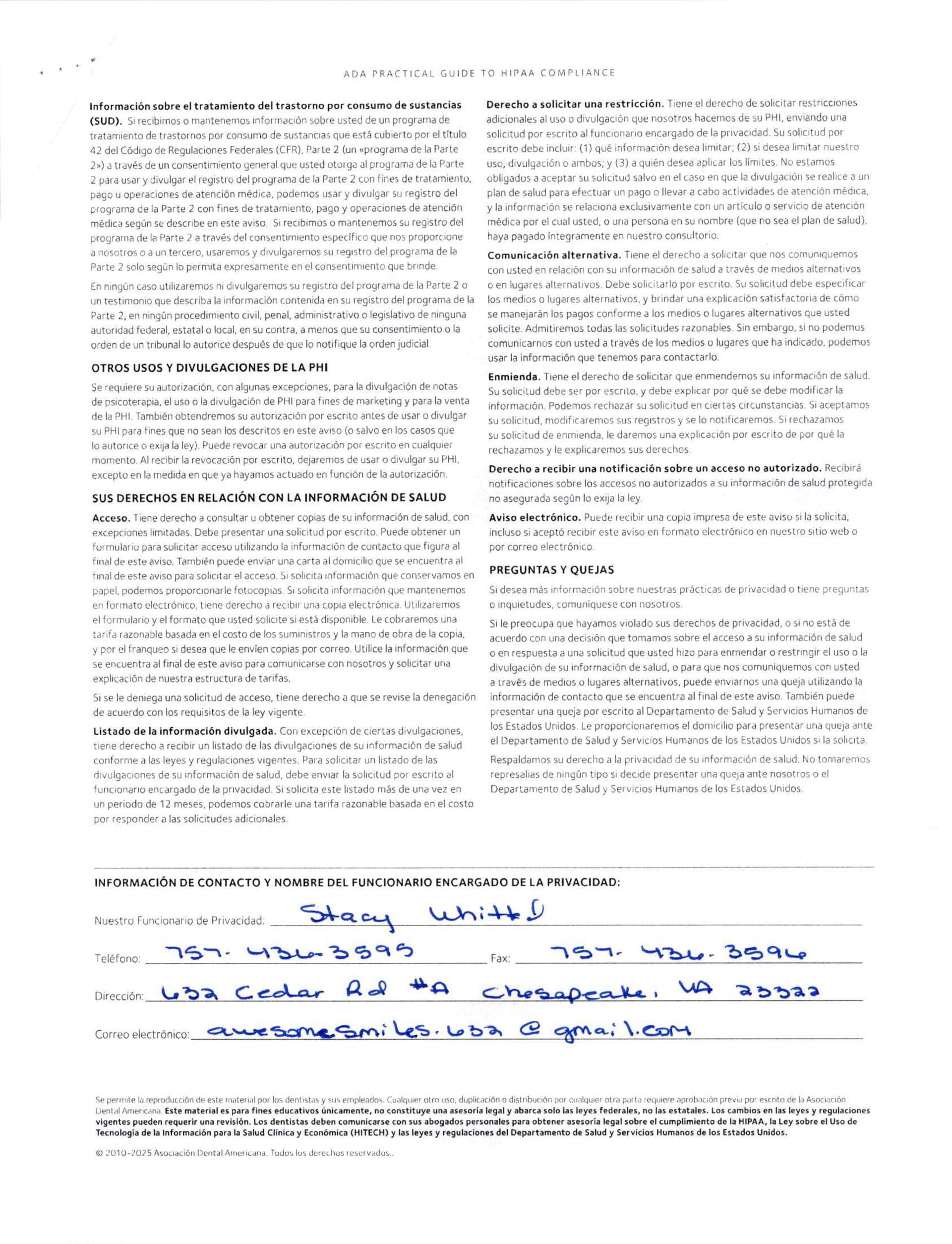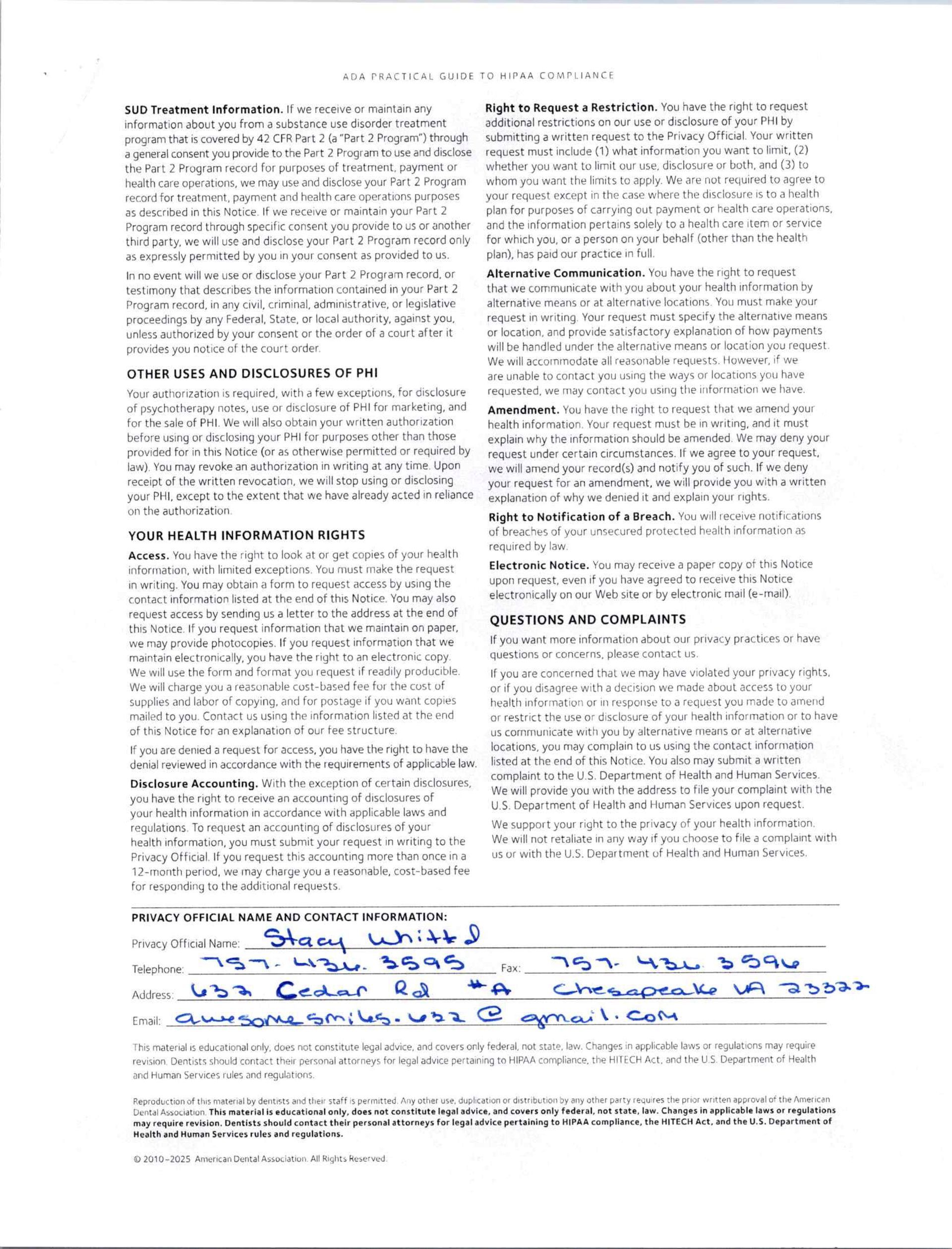 IF YOU HAVE ANY QUESTIONS ABOUT THIS NOTICE OR IF YOU NEED MORE INFORMATION, PLEASE CONTACT OUR PRIVACY OFFICER: Privacy Officer: Jill Mitcham Mailing Address: 632 Cedar Road, Suite A, Chesapeake, Va 23322 Telephone: 757-436-3595